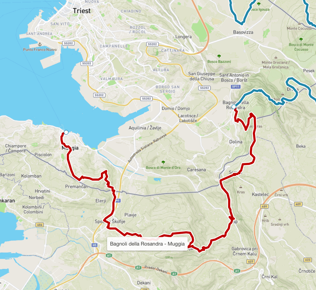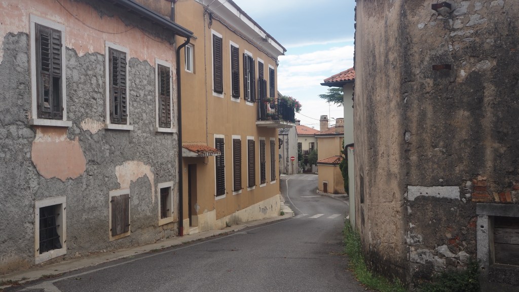 The next part was less appealing. First, I had to walk alongside an industrial estate, then there was a brief interlude by a river before I passed under a motorway and had to cross a couple of fast moving slip roads. All of this took about forty five minutes, until I finally escaped the traffic for a little country road which led right up to the Slovenian border. My phone kept pinging with messages from British Telecom saying ‘welcome to Slovenia’ and ‘welcome to Italy’ – they obviously didn’t know which country I was actually in. By the time I turned away from the border my gps told me I had only 5 km to go- Italy was literally only 5 km wide behind Muggia before it became Slovenia.